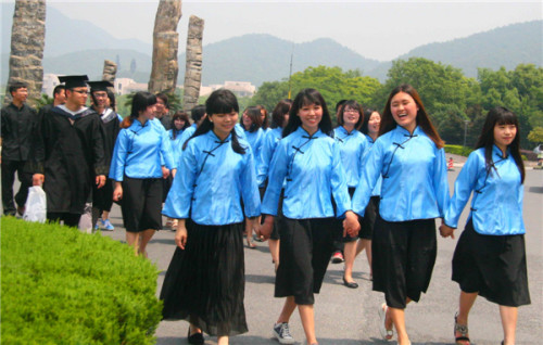 College graduates, wearing period costumes and academic dresses, pose for graduation photos at Zhejiang Agricultural and Forestry University (ZAFU) in Lin'an city, May 22, 2013. China will see a record-high 6.99 million people graduate from college this year. [Photo by Chen Shengwei/Asianewsphoto]