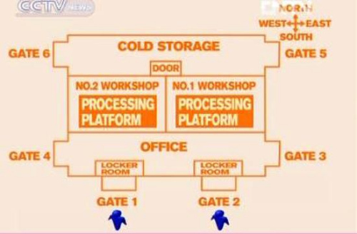 There are two workshops, a cold storage and an office. The plant has six doors along its three sides. Gates 1 and 2 are where workers enter to reach the changing rooms, before they take to their stations. Five of the gates are closed in the day, while the gate to the cold storage is kept open all day for bringing in the poultry.