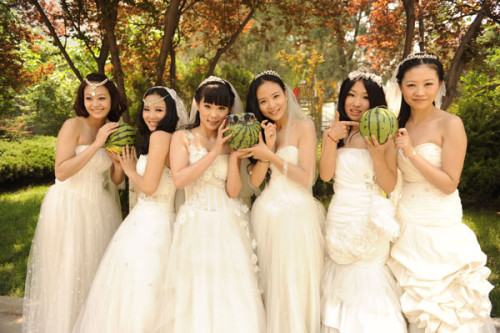 New college graduates, wearing wedding gowns, pose for their graduation photos at Liaocheng University in Liaocheng, East China's Shandong province, June 1, 2013. Several college graduates in wedding gowns pose for graduation photos, to commemorate campus love, youthful days, and the gratitude they have for their university. [Photo by Zhang Zhenxiang/Asianewsphoto]
