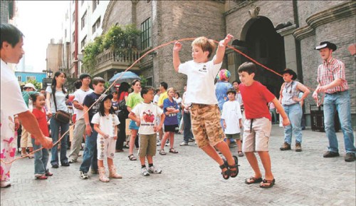 Children of different nationalities play jump rope in downtown Chengdu. (Source: China Daily)