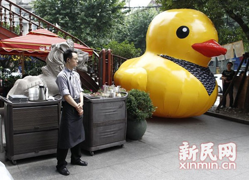 A scaled replica of the "Rubber Duck" by Dutch conceptual artist Florentijn Hofman is seen along a street next to a vendor waiting for customers in Shanghai, June 13, 2013. [Photo: Xinmin.cn]