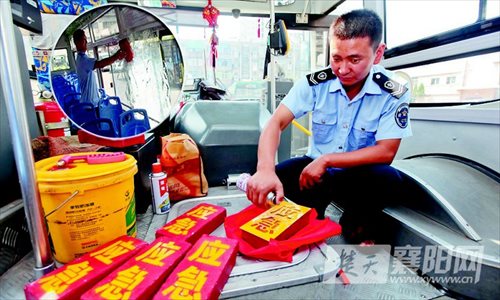 As a cheap solution to replace frequently stolen safety equipment on city buses, transportation authorities in Xiangyang, Hubei Province are considering bricks to be used as glass-breaking devices in case of an emergency.