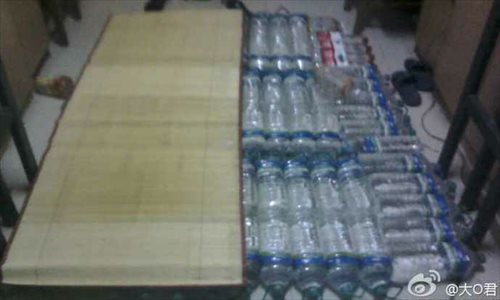 The student behind the idea, surnamed Gong, filled up 85 plastic bottles with water he and his roommates had collected over the semester, lined them up on the floor of his dorm and covered them with bamboo mats.