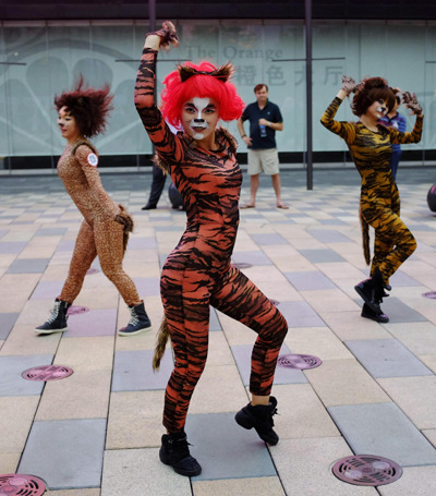 Volunteers dressed in animal costumes perform during an event promoting a love for dogs, in Beijing's Sanlitun area, on June 20, 2013. Dog lovers and animal rights activists have called for the cancellation of an annual dog meat festival scheduled to take place on Friday in Yulin, Guangxi Zhuang autonomous region, voicing concerns over animal cruelty and food safety. [Photo/Agencies]