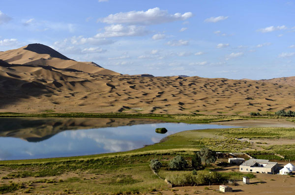 A beautiful view can be seen at a lake in the Badain Jaran Desert, North China's Inner Mongolia autonomous region, June 18, 2013. [Photo/Xinhua]