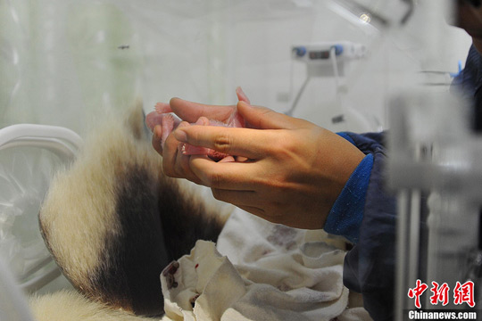 A worker holds one of the twin panda cubs given birth by their mother Haizi at the China Conservation and Research Center for the Giant Panda at the Wolong Nature Reserve in Wenchuan County, Southwest China's Sichuan Province, June 22, 2013. The giant panda successfully gave birth to twins on Saturday, the first pair ever born globally this year. One cub is a female and weighs 79.2 grams. [Photo: CNS/Zhou Jing]