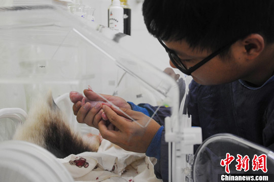 A worker holds one of the twin panda cubs given birth by their mother Haizi at the China Conservation and Research Center for the Giant Panda at the Wolong Nature Reserve in Wenchuan County, Southwest China's Sichuan Province, June 22, 2013. The giant panda successfully gave birth to twins on Saturday, the first pair ever born globally this year. One cub is a female and weighs 79.2 grams. [Photo: CNS/Zhou Jing]