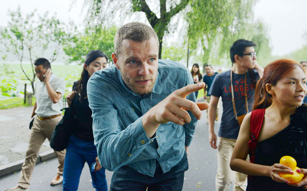 Dutch artist Florentijn Hofman looks for a location for his big yellow duck show at the West Lake scenic area in Hangzhou, East China's Zhejiang province, June 26, 2013. [Photo/Asianewsphoto]