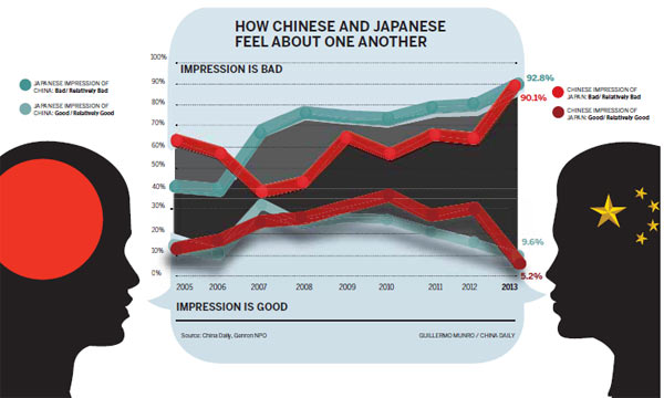 Results of the survey, co-sponsored by China Daily and the Japanese nonprofit think tank Genron NPO, are the worst in almost a decade. They are even worse than in 2005, when Japan's then-prime minister Junichiro Koizumi repeatedly visited the Yasukuni Shrine honoring Japan's war dead, including war criminals from World War II.