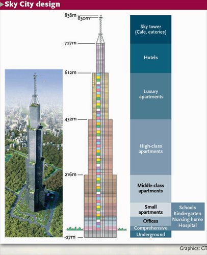 As the project's ad video on the group's website shows, the skyscraper aims to top out at 838 meters. The plan is for Sky City to have 202 floors and a total area of over 1 million square meters, which would allow it to accommodate 30,000 people in residences and offices.