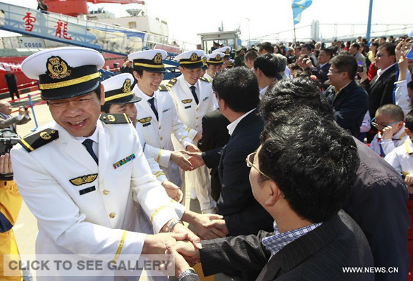 China's ice-breaker, the Xue Long, has docked in Shanghai, after returning from a six-month Antarctic mission that also involved rescuing a stranded Russian ship and joining the search for the missing Malaysian aircraft in the south Indian Ocean.