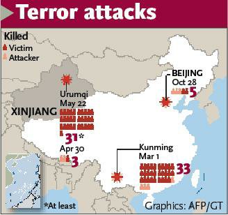 Meanwhile, the US Embassy to China posted on its Sina Weibo account Thursday that it wished to send sincere condolences to all people affected by the "violent attacks" in Urumqi, refraining from using the term "terrorism." The post received over 16,000 comments, most questioning its "double standard" on defining terrorism.
