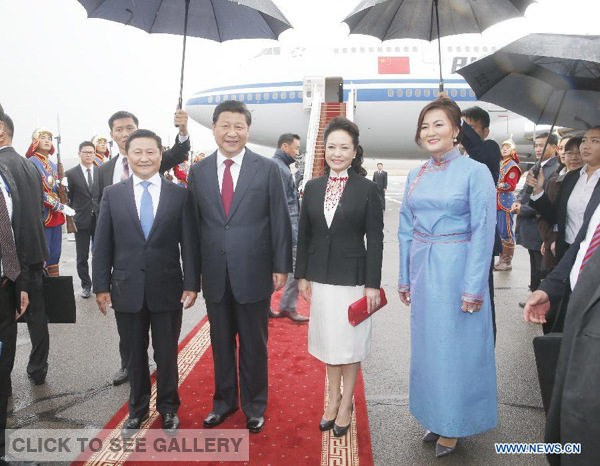 Xi and his wife Peng Liyuan were greeted by Mongolian Prime Minister Norov Altankhuyag and his wife at the airport in Ulan Bator.