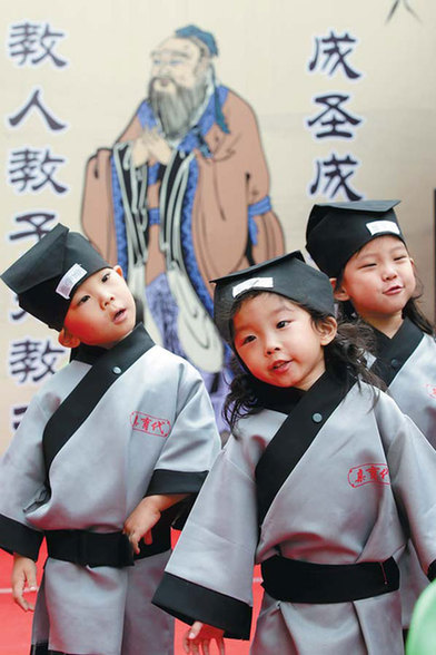 Children recite traditional literary works at a ceremony to commemorate the 2,565th birthday of Confucius at the QYD International Kindergarten in Beijing on Sunday. Wang Jing / China Daily