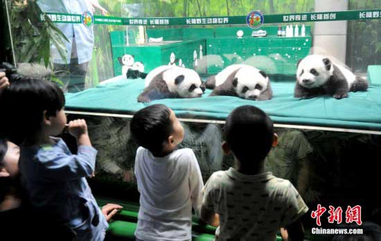 The only living panda triplets made their first public appearance in Guangzhou. (Photo: Chinanews.com)