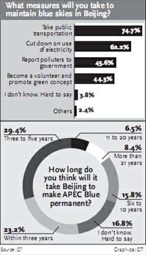 Over half of respondents living in Beijing believe that clean air experienced during the Asia-Pacific Economic Cooperation (APEC) meetings will become normal in Beijing within five years, according to a poll conducted by the Global Times Global Poll Center.