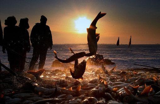 In a tradition that's been around for over 1,000 years, local fishers cut into the thick ice and cast their long nets deep into the frigid waters below.