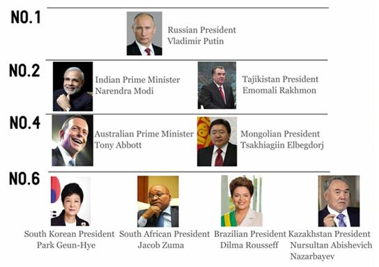 Indian Prime Minister Narendra Modi and Tajik President Emomali Rakhmon tied for the second with seven appearances each, followed by Mongolian President Tsakhiagiin Elbegdorj and Australian Prime Minister Tony Abbott.