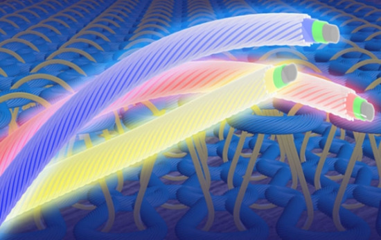 The light, flexible, fiber polymer light-emitting electrochemical cells (PLEC) are made by wrapping metal wire cathode in a carbon nanotube sheet that is the anode. They activate an electroluminescent polymer layer in between, which emits light.