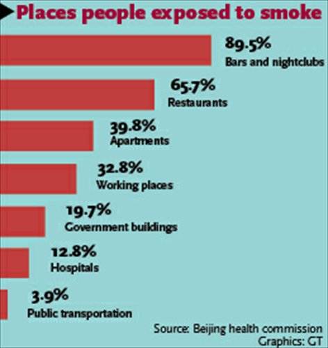 The ban will face its steepest challenge in bars and restaurants, as 90 percent of Beijing's 10 million victims of secondhand smoke are exposed at bars and nightclubs, while 66 percent are exposed at restaurants, the survey found.