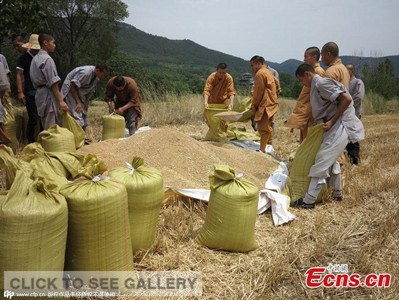 On a farm to the west of the Pagoda Forest at the Shaolin Temple in Dengfeng, Central China's Henan Province, scores of monks are busy harvesting wheat.