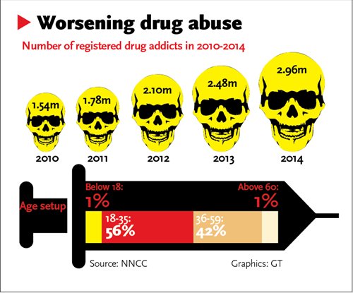 By the end of 2014, China had 2.96 million registered drug addicts. Estimates have it that the total number of drug users exceeds 14 million, which means one out of 100 Chinese may have used drugs, he added.
