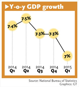 China's GDP growth slipped to a six-year low of 7 percent in the first three months of 2015.