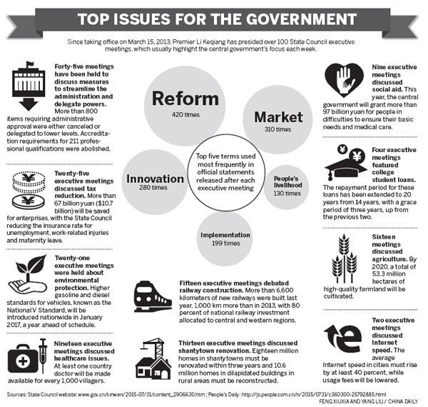 That meeting marked the 100th presided over by Premier Li Keqiang at the former royal retreat, and also signaled the start of the second half of Li's five-year term.
