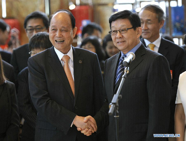 Straits Exchange Foundation (SEF) chairman Lin Join-sane (L), who leads a Taiwan delegation to the mainland, is welcomed by mainland-based Association for Relations Across the Taiwan Straits (ARATS) president Chen Deming on his arrival for talks with mainland negotiators in Fuzhou, capital of southeast China's Fujian Province, Aug. 24, 2015.(Xinhua/Wu Wei)