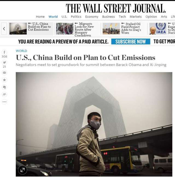 The Wall Street Journal focused on the climate change issue, saying President Barack Obama and Chinese President Xi Jinping will add to earlier pledges to cut greenhouse-gas emissions with specific guidance on what the two countries will do at home to keep climate change at bay.