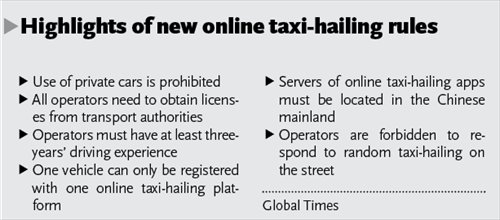 The new regulations will address the problem that the online car-hailing model had "disrupted normal market order, which has affected the taxi industry and social stability," authorities said.