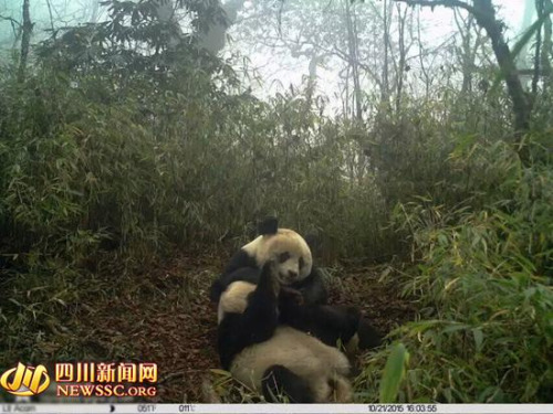 In a clip filmed on Oct. 21, two wild giant pandas of similar size were seen playing with each other on a mountain in Wolong National Nature Reserve. Experts said it was the first time the reserve observed a pair of pandas living together during non-mating season.