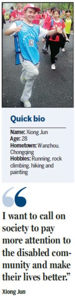 As a celebrity among runners, Xiong devotes himself to many charity activities on behalf of disadvantaged people. This year, he participated in a fundraising running event in Chongqing to support poor college students. In the coming year, he plans to lead a team of 20 to 30 disabled people driving electric wheelchairs from Chongqing to the Tibet autonomous region.