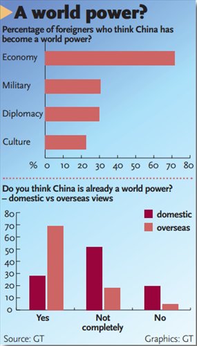 However, there is a huge gap between Chinese people and foreigners in seeing China as a global power - only 27.9 percent of Chinese respondents said yes, the survey shows.