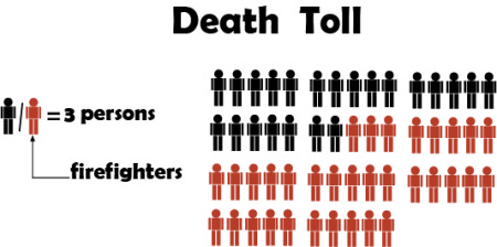 As of September 11, 2015, the death toll had risen to 165, including 99 firefighters, 55 civilians and 11 police officers.