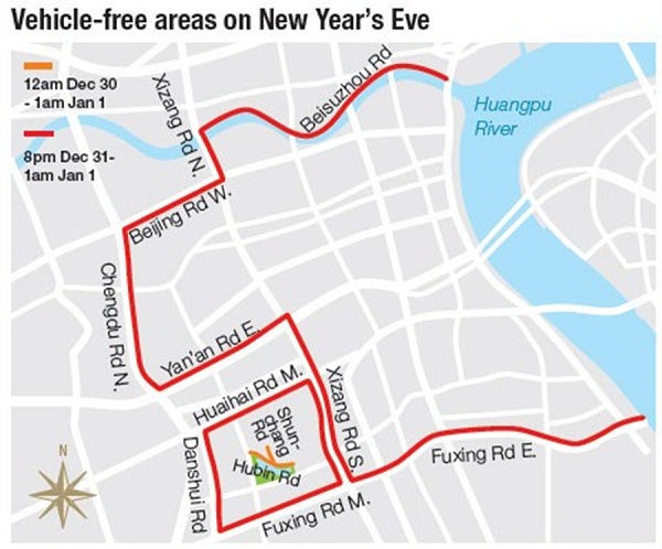 Shanghai police have announced traffic restrictions on some of the roads in the Bund and Xintiandi areas for New Year's Eve on Thursday evening.