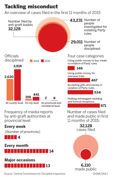 Eight officials at provincial or ministerial level, 441 city-level and 3,818 county-level officials were punished in the first 11 months of last year. The figures for officials at the three levels for the whole of 2014 were two, 198 and 2,630, respectively.