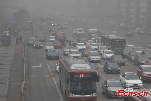 Vehicles run amid heavy smog and thick fog in Beijing, Dec. 25, 2015.(Photo: China News Service/Jin Shuo)