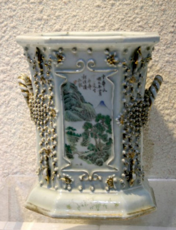 The octagonal pot, 23 cm tall, features scholars in a bamboo forest. An eighteen-star flag symbolizing the victory of the Wuchang uprising, and a five-color flag, first national flag of the Republic of China, are also painted on the pot.