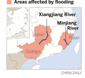 The State Flood Control and Drought Relief Headquarters warned that water levels of rivers in Fujian, Guangdong and Jiangxi provinces and the Guangxi Zhuang autonomous region could continue to rise in the next few days after rainstorms.
