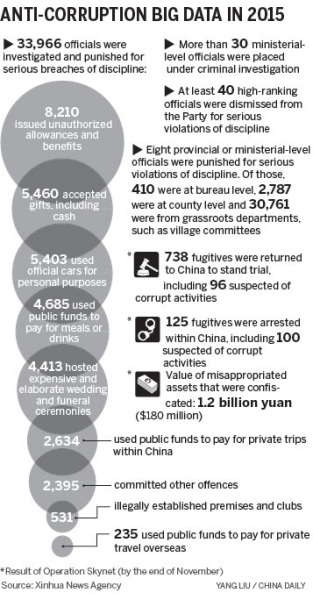 Last year, disciplinary departments nationwide investigated 330,000 allegations, finding evidence of corruption in 317,000 of the cases. About 336,000 officials have been subject to internal Party punishments, and 14,000 case files have also been sent to the courts, she said. Since 2012, cases have been filed in 31 provinces, autonomous regions and municipalities, while a number of sectors, including the environment, sports, State-owned enterprises, financial institutes and the legal authorities have also seen a rise in the number of cases of corruption.