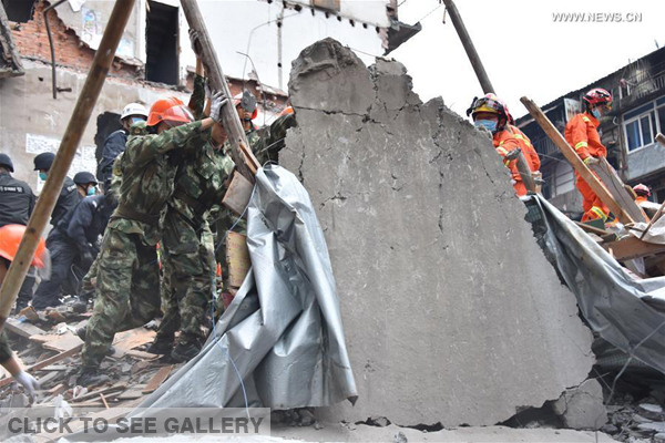 Rescuers work at the accident site after buildings collapsed in Wenzhou City, east China's Zhejiang Province, Oct. 10, 2016. (Photo/Xinhua)