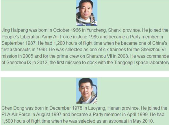 Jing previously flew on Shenzhou VII in 2008 and Shenzhou IX in 2012. His new mission will take him past the only other Chinese astronaut who has gone into space more than once, Nie Haisheng, who traveled on Shenzhou VI in 2005 and Shenzhou X in 2013.