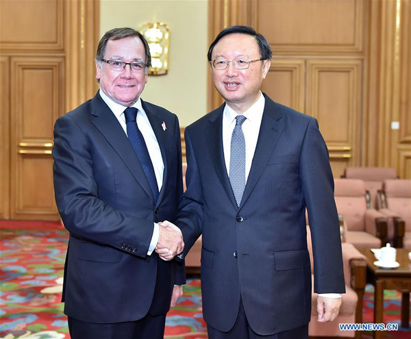 State Councilor Yang Jiechi also met with McCully earlier Tuesday, calling on both sides to coordinate China's Belt and Road Initiative and New Zealand's 30-year infrastructure development plan.