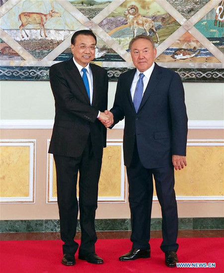 Chinese Premier Li Keqiang met with Kazakh President Nursultan Nazarbayev on Thursday in Astana, during his official visit to Kazakhstan. [Special coverage]