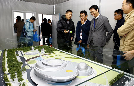 Guests visit the model of the Shanghai Planetarium during its foundation laying ceremony in Shanghai, east China, Nov. 8, 2016. Covering an area of 38,164 square meters, the planetarium will include a main building and ancillary constructions, such as an observation base for young people, a solar tower and observatory. (Xinhua/Fang Zhe)