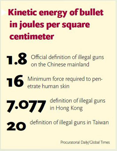 According to the current legal definition of a firearm, which was made in 2010, guns able to fire bullets with a kinetic force of over 1.8 joules per square centimeter - less than it takes to pierce human skin - will be considered illegal.