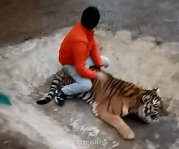 The short clips, reportedly around 30 in number, were brought to light by a user on China's Twitter-like Weibo and show a man petting tigers, tugging their tails and even riding them as they crouched in their enclosures.