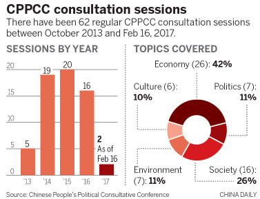 As of Feb 16, 62 such sessions had been conducted since October 2013, with more than 2,233 national political advisers and 137 experts and scholars participating. Officials from related government departments have also been invited to attend sessions to hear suggestions.