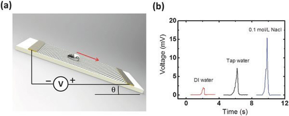 When a drop of water drips down and flows over the graphene, the caused deformation of the piezoelectric template can generate an induced voltage in the flow direction. Therefore, the template as a supporting material to the graphene plays a crucial role in the electricity-generating process.
